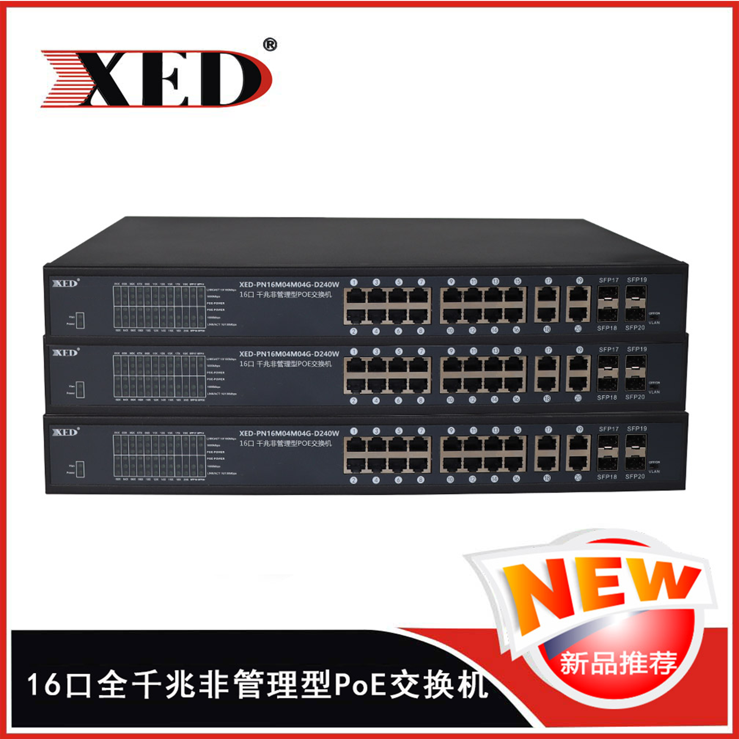 16個10/100M自適應RJ45電口,4個1000M上聯口和1個千兆SFP光纖模塊插槽;千兆非管理型交換機。