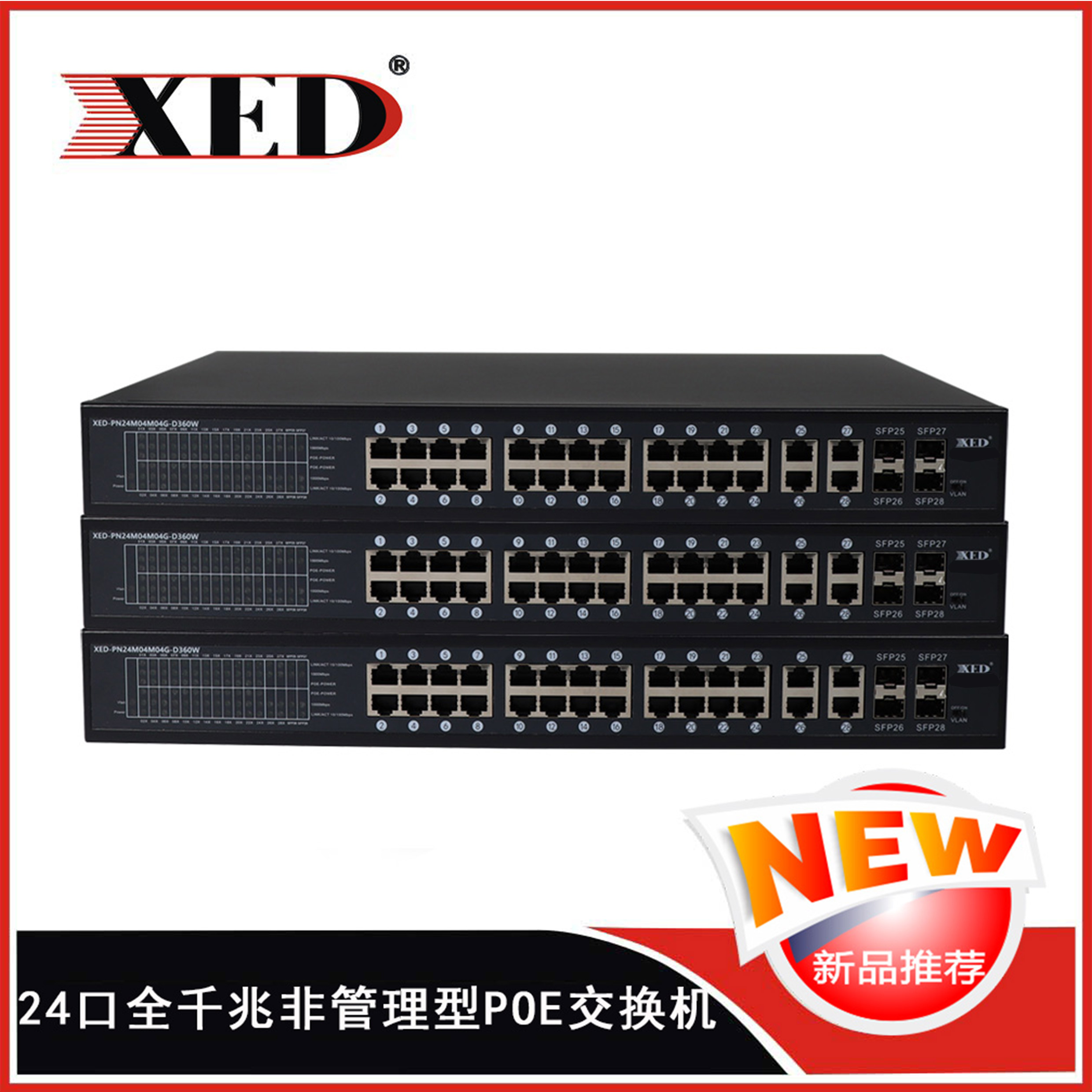 24個10/100M自適應RJ45電口,4個千兆UPLINK端口、4個SFP端口;千兆非管理型交換機。