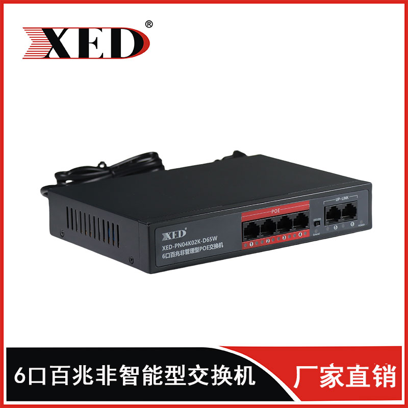XED-PN04K02K-D65W是一款高性能的百兆POE交換機,可通過網線為無線AP,攝像頭等PD設備提供最大單端口30W...